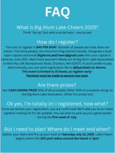 The cost to register is $40 PER BOAT. Number of people per boat does not matter. The more people, the more fun! Dog and kid friendly. Designate a boat team captain and email BigAlumLakeCheers@gmail.com with your captain’s name by June 23 . Mail check payment (Made out to Big Alum Lake Association) to Mari Roy (34 Stoneybrook Road, Charlton, MA 01507). If you’d prefer to pay electronically, you can send registration fee to @RyanSzat1 on Venmo and the money will be transferred to Mari. This event is limited to 20 boats, so register early! Payment must be made to secure your spot.